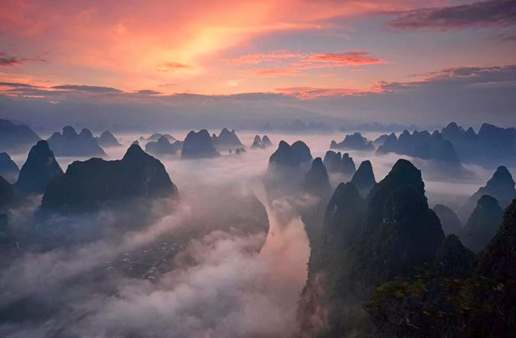 清晨登临八角寨顶,浓雾近漫足趾,远连天涯,无边无际,幽谧如仙界,轻风过处,雾如千军万马团团拢来,呼冲唤杀,结伍夺岭,旌旗飘飘,如遮如掩;绕峰游弋的山峦与弥弥漫漫的白雾时分时合,白雾成浪,一浪接一浪,一浪高过一浪,云海中的山峰或起或伏,或隐或现,令人陡生:“海到无边天作岸,狂涛吞山我为峰”的豪情壮志,一俟风静,雾海亦波平浪静,待到旭日东升,泼洒万缕金光,映得天红如丹,雾红似火。