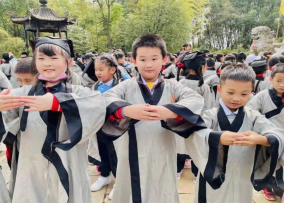 在青山绿水间,同学们跟随讲解老师走进博大精深的国学课堂【关公阁】,学习国学礼仪,国学礼仪的规范步骤有哪些呢?带着一个个问题,孩子们化身古代书童,集体更换国学服饰,着汉服风度翩翩,抱拳彬彬有礼,学习服饰礼仪、手势礼仪、称呼礼仪,感受中华文化的魅力和中华民族的翩翩气韵,增强民族自信和自豪感。