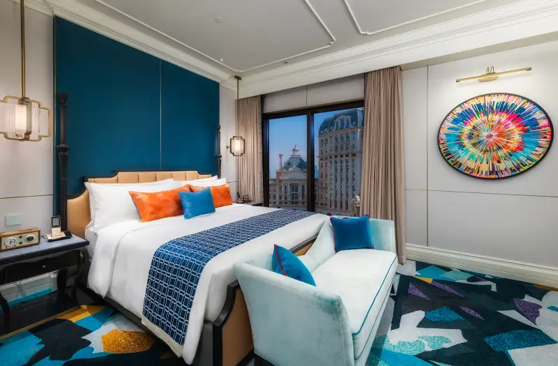澳門上葡京鄰近路凼東亞運體育館及輕軌車站,便捷往來機場、凼仔碼頭等,僅25分鐘車程即達澳門 半島市中心。 酒店大樓提供 1,350 間瀰漫現代中國風的客房和套房,飽覽綠茵勝境花園及路凼醉人景緻。房內備有高速寬帶上網、55 英寸平面電視、豪華浴缸及獨立淋浴間,並採用 Grohe Freehander 淋浴系統。 水療中心設有 14 間奢華典雅的水療套房提供專業護理、Gentlemen's Tonic 美髮中心打造個人化造型,以及由 Bastien Gonzalez 主理的 PEDI:MANI:CURE