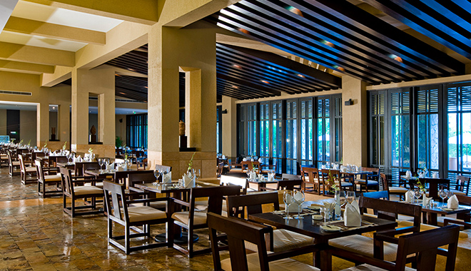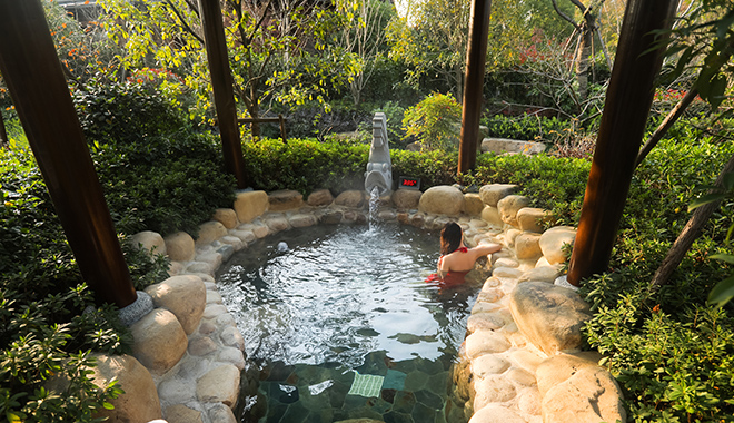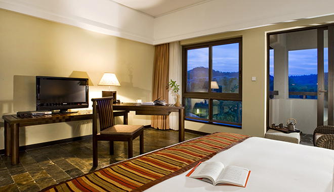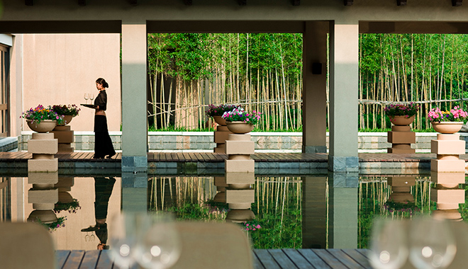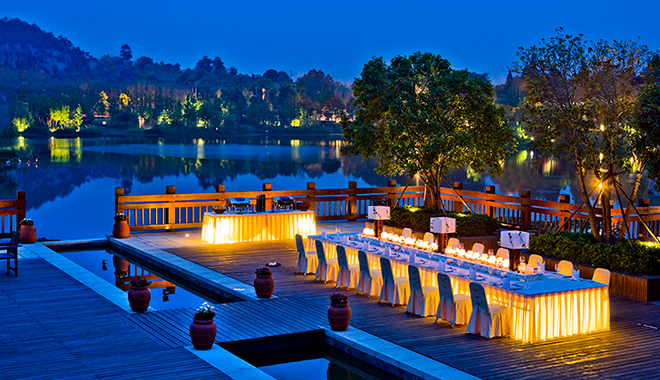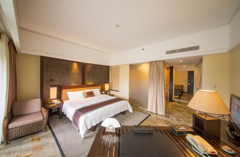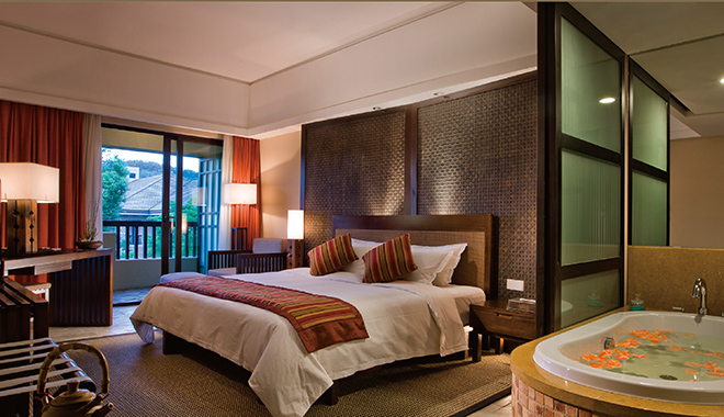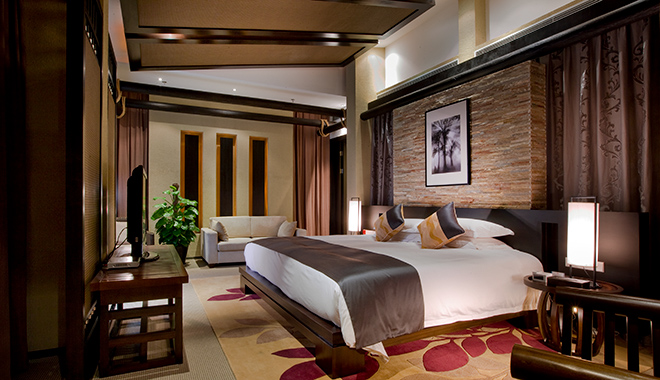 酒店占地约274.8亩,总建筑面积7.3万平方米,并拥有4万多平方米的水面及2万平方米的道路与广场。整体设计古朴典雅,气势宏伟,临湖而建的庭院式建筑主体分为连绵而成的十个区,环绕在丘陵绿地和湿地湖泊之中,营造出人文与自然生态景观融合的氛围,为来自世界各地的尊客提供高品质的休闲度假享受。