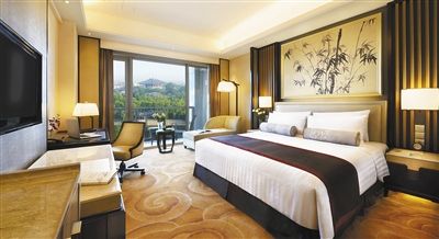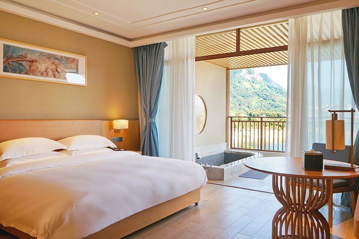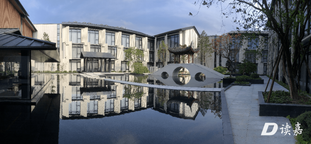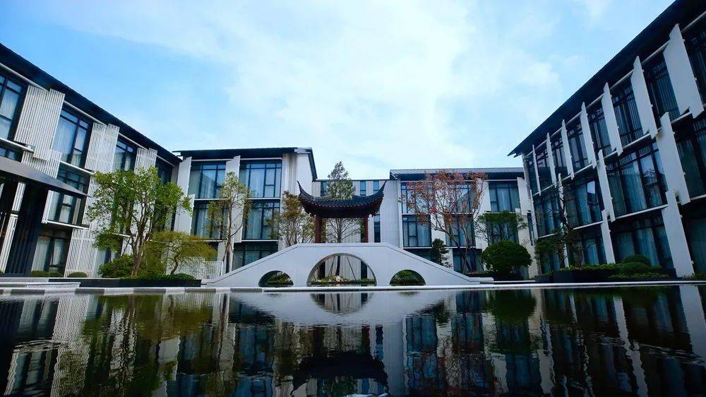 景色怡人,紧致园林,小桥流水,酒店结合了江南园林风格和现代化新中式风格,大堂高耸的湖绿色屏风,处处体现了大气和中国风。一点中国红,一潭南湖绿,每一处的设计都充满了南湖的人文情怀,呈现出东方美学与中式传统元素的惬意相融,体现出“国风雅致。