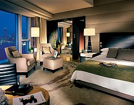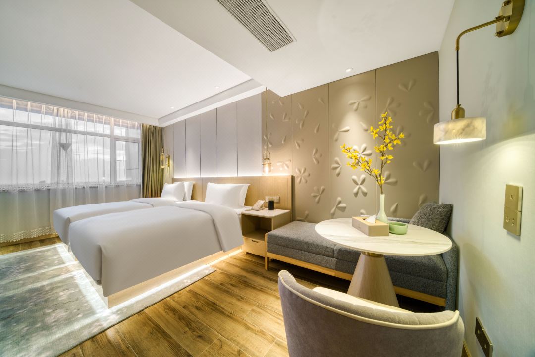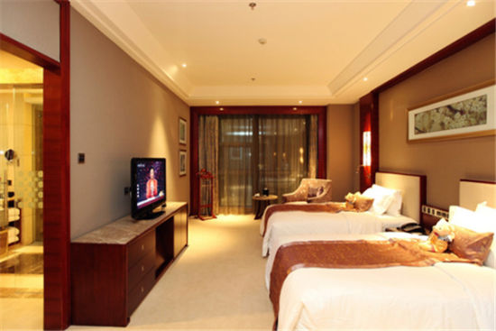 酒店房间里有最豪华的布艺、家具和设以浓重失活泼的色调、豪华舒适、至尊至贵的体验。走入房屋,客厅的地是用木地板做的。墙上挂着一台50寸的液晶电视,高配置按摩椅,柔软舒适,卫生间里干净整洁。