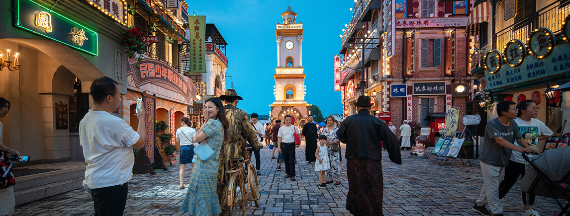 19:00 游览广州街香港街景区(含有《流金岁月》《大话飞鸿》《怒海争锋》节目)。