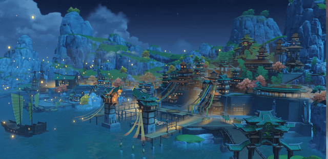 第三天到达璃月港,参观往生堂,在新月轩用餐,入住望舒客栈。
