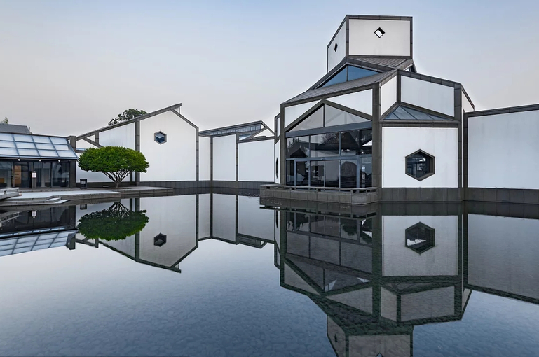 新馆大门是入口,忠王府大门是出口。进馆后可以好好欣赏一下这座新馆建筑,它由建筑大师贝聿铭设计,有着传统的苏州园林风格,高低错落,深灰色屋面与白墙相配,清新雅致。屋顶上金字塔形的玻璃天窗让博物馆内充满自然光线,在大门、天窗廊道、凉厅及各展厅都可以看到这个特点。馆中还有庭院、水池、石桥,既传统又现代。漫步在新馆庭院中,蓝天、白墙、绿竹、清水,十分惬意;走在石桥上还能看到白墙下用砂石堆砌而成的画,很有特点,不妨拍照留念。