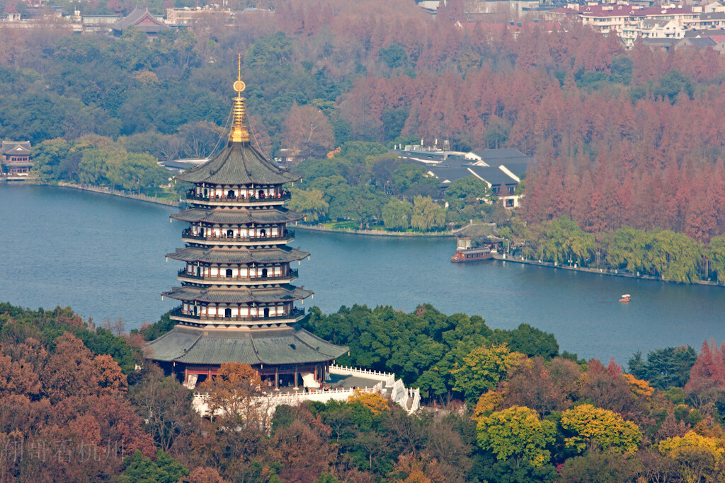 雷峰塔(Leifeng Tower),又名黄妃塔、西关砖塔,位于浙江省杭州市西湖区,地处西湖风景区南岸夕照山之上,是吴越国王钱俶为供奉佛螺髻发舍利、祈求国泰民安而建,始建于北宋太平兴国二年(977年),历代屡加重修,现存建筑以原雷峰塔为原型设计,重建于2002年;是"西湖十景"之一,中国九大名塔之一,中国首座彩色铜雕宝塔。 雷峰塔主体为平面八角形体仿唐宋楼阁式塔,各层盖铜瓦,转角处设铜斗拱,飞檐翘角,总高71.679米,总占地面积3133平方米,总建筑面积为6089平方米;塔身对径28米,边长11米,周长88米,塔底为原雷峰塔遗址。 西溪国家湿地公园,距离杭州西湖五公里,在杭州天目山路延伸段,是罕见的城中次生湿地。曾与西湖、西泠并称杭州"三西",是目前国内第一个也是唯一的集城市湿地、农耕湿地、文化湿地于一体的国家湿地公园,具有"杭州之肾"和"副西湖"美誉。园区约70%的面积为河港、池塘、湖漾、沼泽,正所谓"一曲溪流一曲烟",整个园区六条河流纵横交汇,水道如巷、河汊如网、鱼塘栉比如鳞、诸岛棋布,形成了西溪独特的湿地景致。