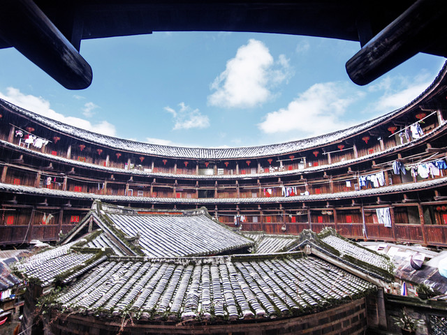 怀远楼建于1905-1909年,是目前建筑工艺精美、保护好的双环圆形土楼。楼高四层13米,直径38米,每层34间,共136间,为简氏家族所建。怀远楼引人注目之处在于内院核心位置的祖堂,也就是家族子弟读书的地方“斯是室”。“斯是室”精巧秀气,上下堂建筑占地190平方米,室内雕梁画栋,古朴天然,书卷气浓。怀远楼为二环楼,建筑师是振成楼的建筑师,楼的设计相当工整。楼内有块何应钦赠送的金匾“助我义师”,楼前平地有块用鹅卵石排成的太极图案。土楼和村子被水稻田和茶山包围着,一幅安宁的田园图。怀远楼的楼基用巨型鹅卵石和三合土垒筑3米多高,墙体至今光滑无剥落。站在楼外墙边把脸贴着墙向上看,能看到楼基下围小,中间大,上层又逐渐缩小,好象橄榄状,此结构符合力学,可抗风,使楼更结实。